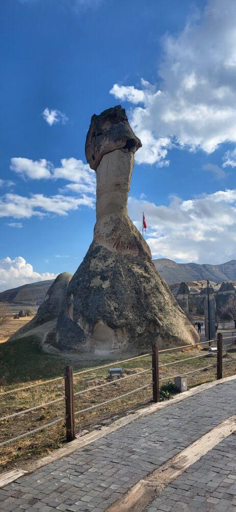 z niezwykłych kominów wróżek — wysokich, stożkowych formacji skalnych, które powstały w wyniku erozji tufu wulkanicznego na przestrzeni tysięcy lat. Jest to niezwykły widok, który sprawia, że Kapadocja wydaje się jakby nie była z tej Ziemi.