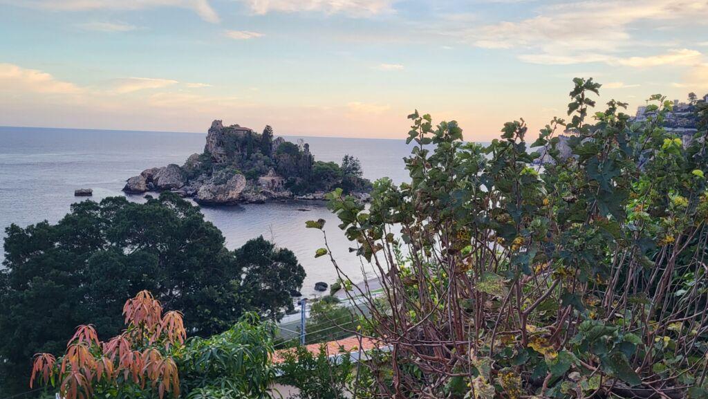 Najpiękniej widać Isola Bella z punktu widokowego przy drodze prowadzącej do Taorminy. To jedno z tych miejsc, gdzie człowiek automatycznie zwalnia, wyciąga telefon i robi zdjęcie, nawet jeśli obiecywał sobie, że tym razem będzie „żyć chwilą”. Trudno się oprzeć — panorama jest spektakularna.